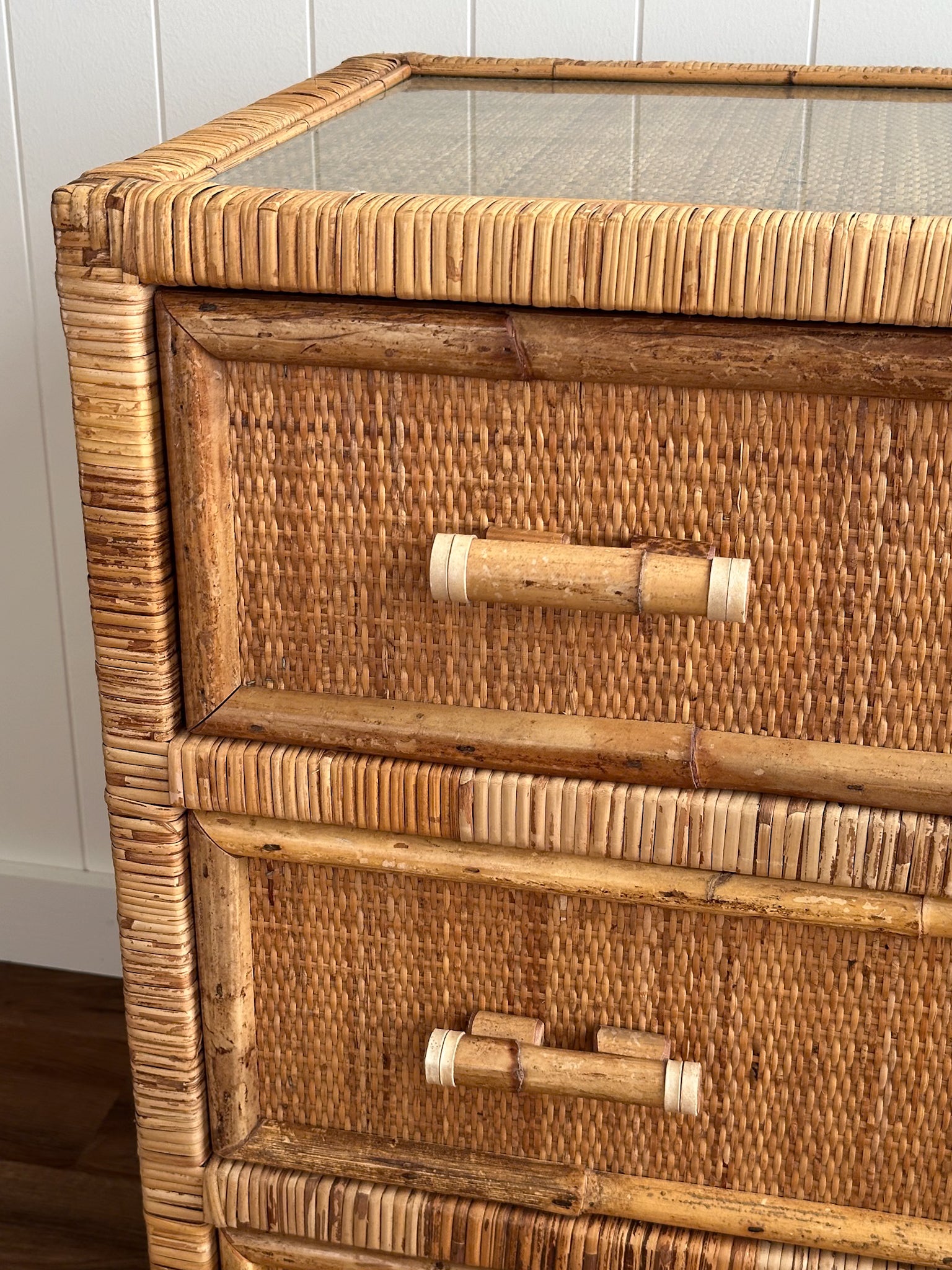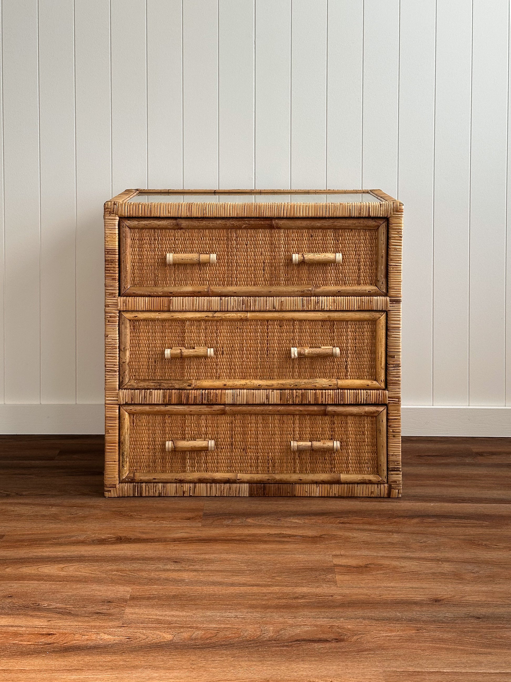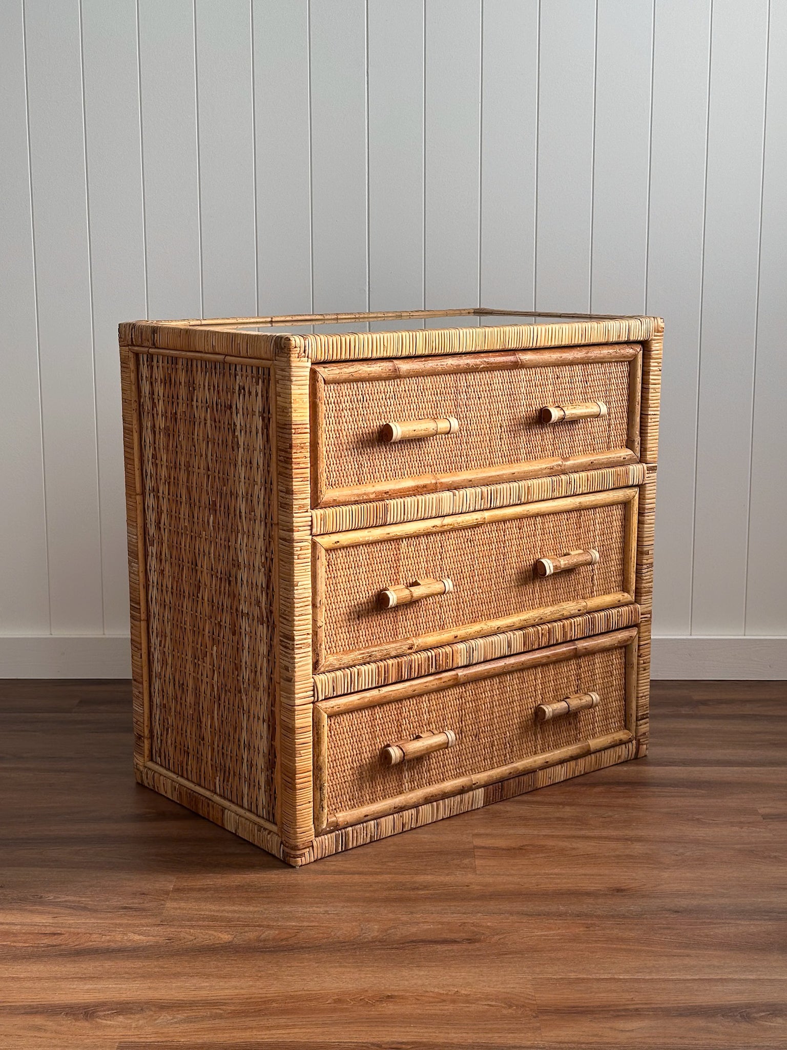 Three smooth-gliding drawers offer generous storage, allowing the chest to work comfortably as a small dresser, oversized nightstand, entryway storage piece, or media chest in a smaller living space. The woven surface brings softness and depth, while the original glass top adds function and protection without interrupting the texture below.