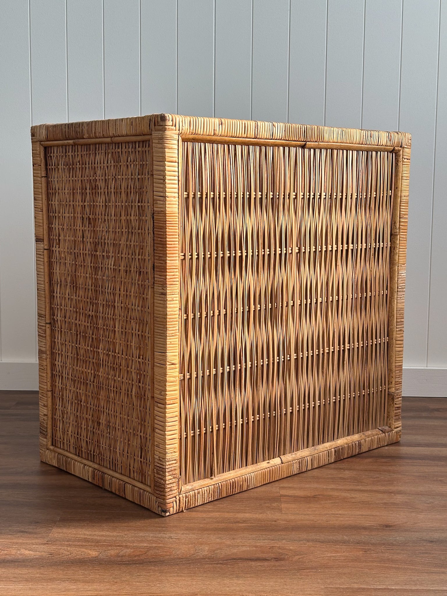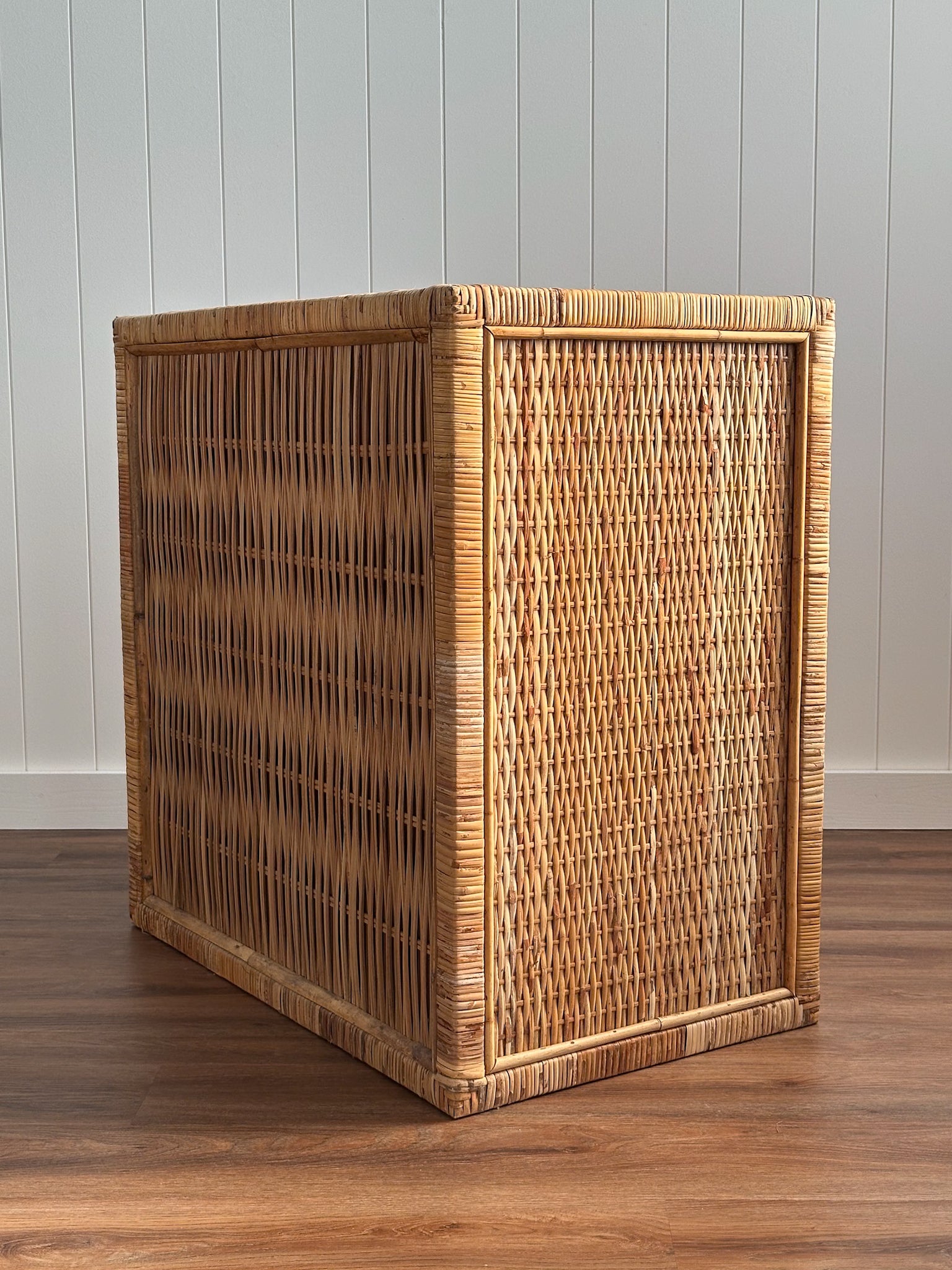 The rattan shows natural variation throughout—tight weaving, subtle tonal shifts, and tactile details developed over decades of age. Solidly constructed and thoughtfully made, the piece has a presence that feels grounded yet light in the room.