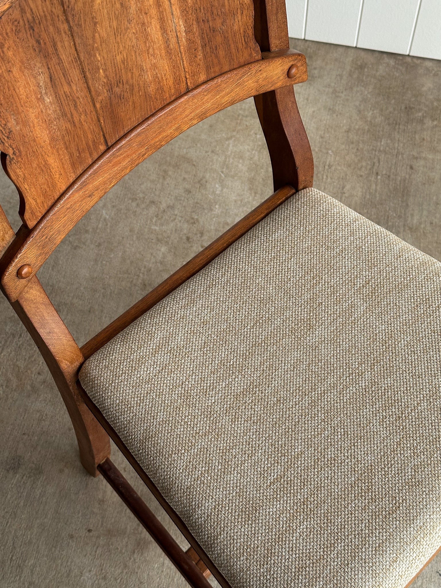 Set on turned front legs with block-and-ring detailing and joined by stretchers below, the chairs carry a warm, time-softened patina with light antique wear throughout. Seats newly upholstered in an oatmeal textile.