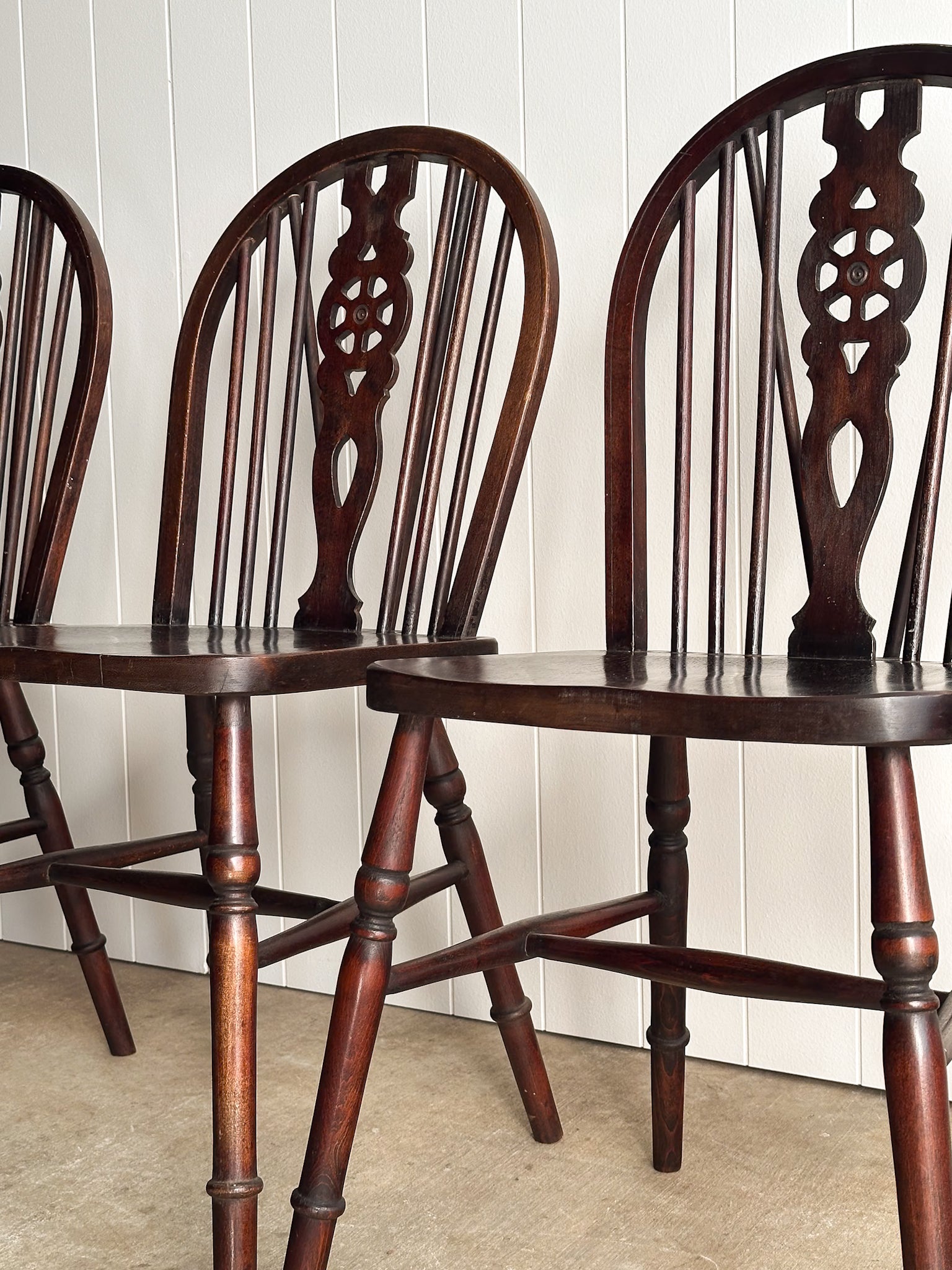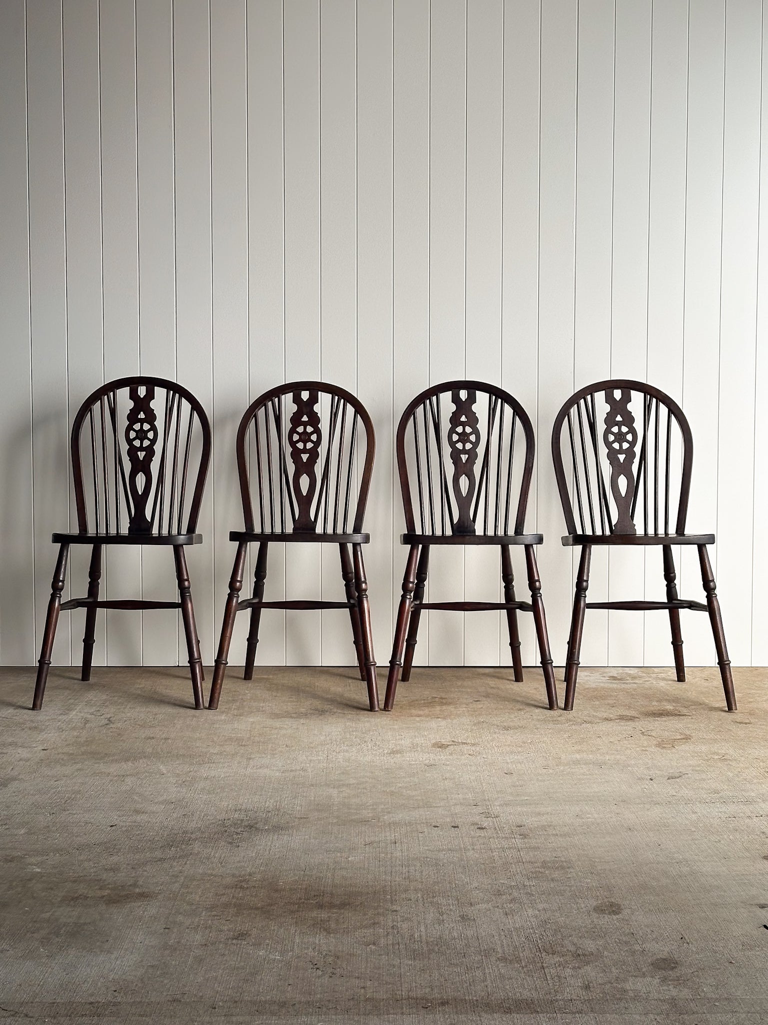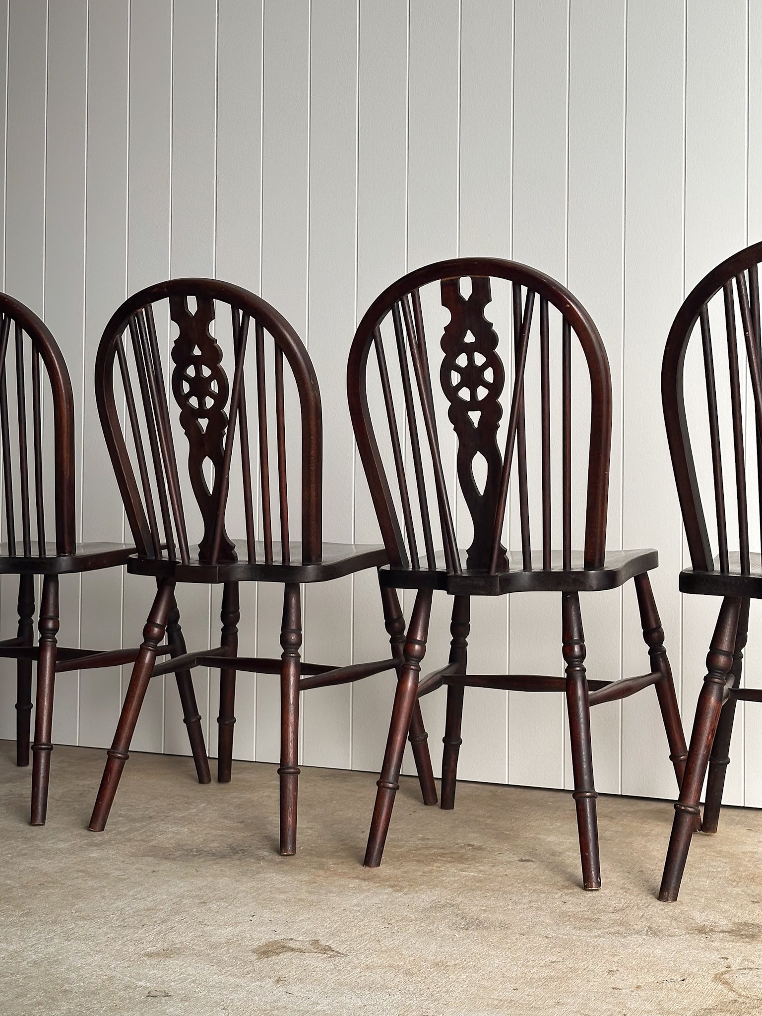 Antique Windsor dining chairs crafted in solid wood with wheel-back designs, sculpted plank seats, and turned legs. The set presents a rich, darkened patina with light visible wear throughout, including surface marks, softened edges, and tonal variation consistent across all four chairs.
