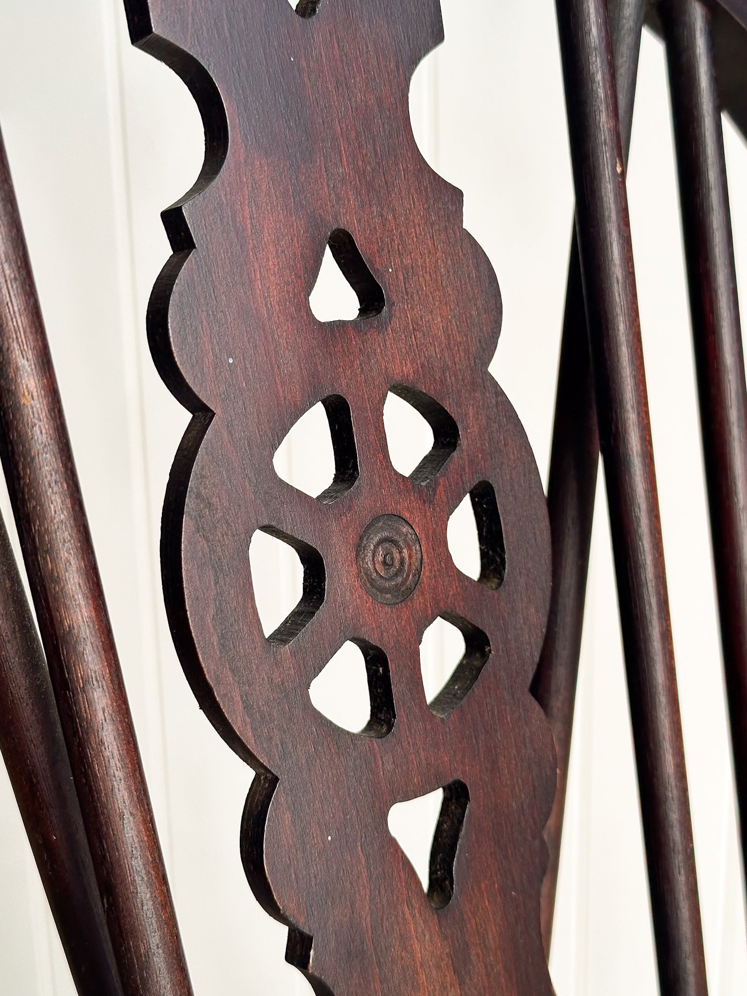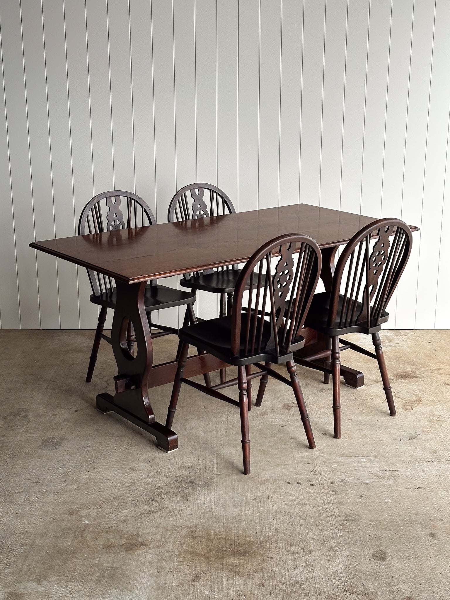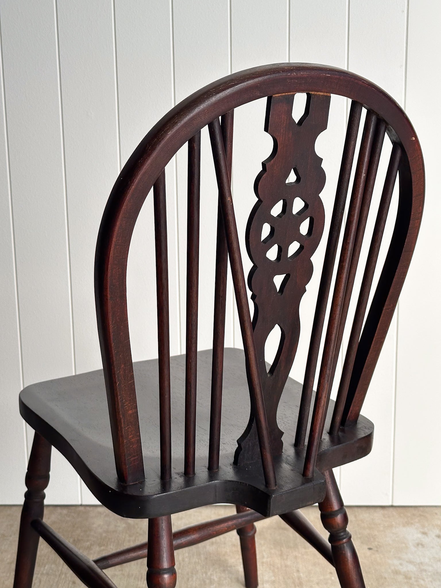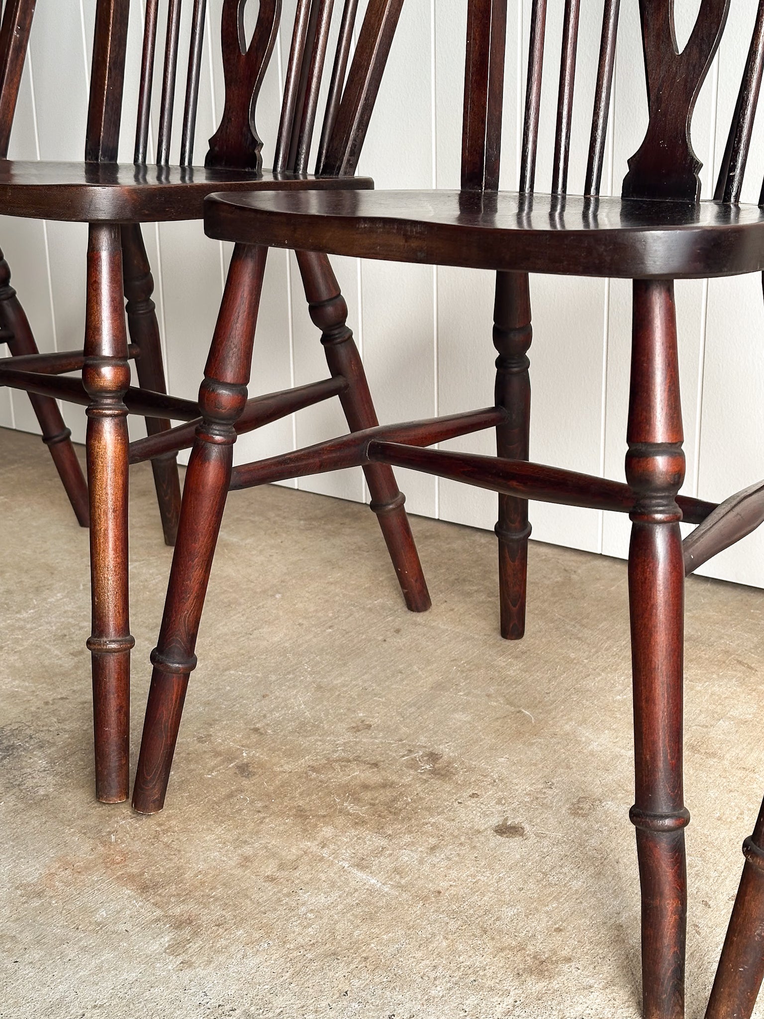 Antique Windsor dining chairs crafted in solid wood with wheel-back designs, sculpted plank seats, and turned legs. The set presents a rich, darkened patina with light visible wear throughout, including surface marks, softened edges, and tonal variation consistent across all four chairs.