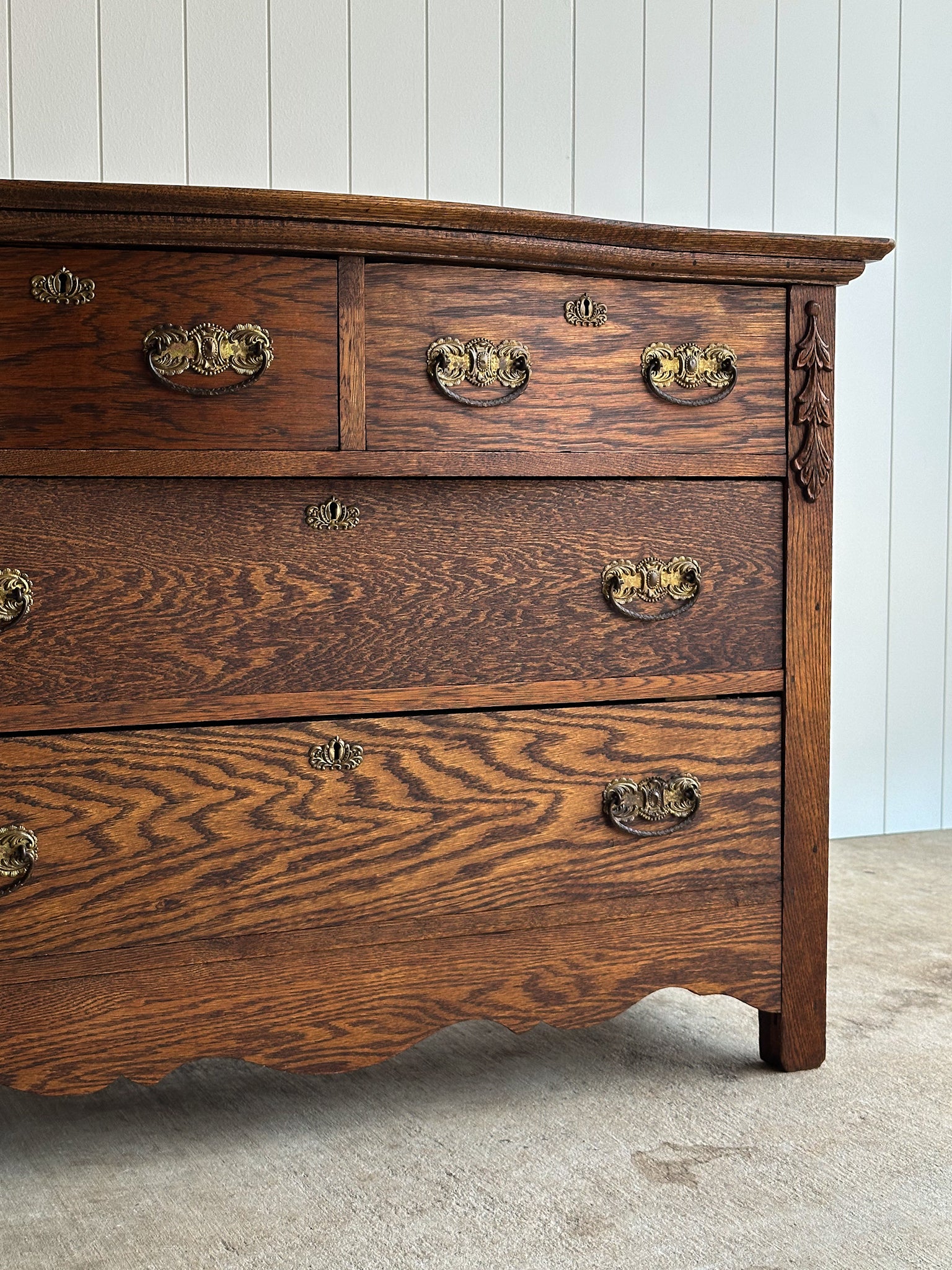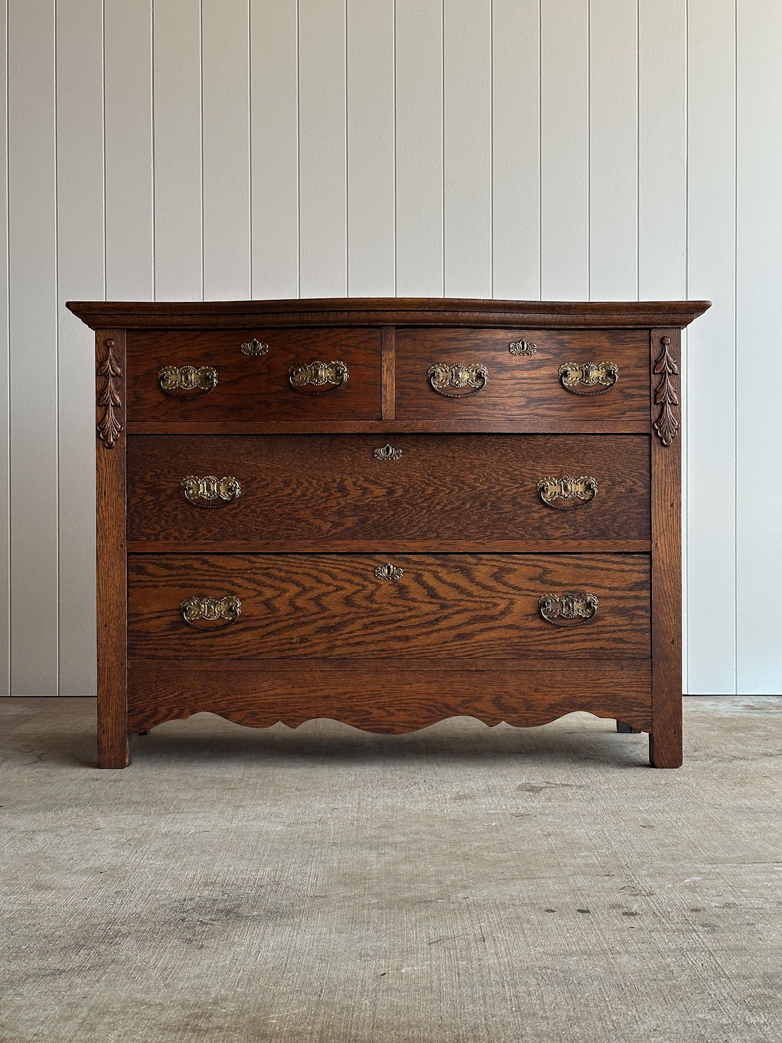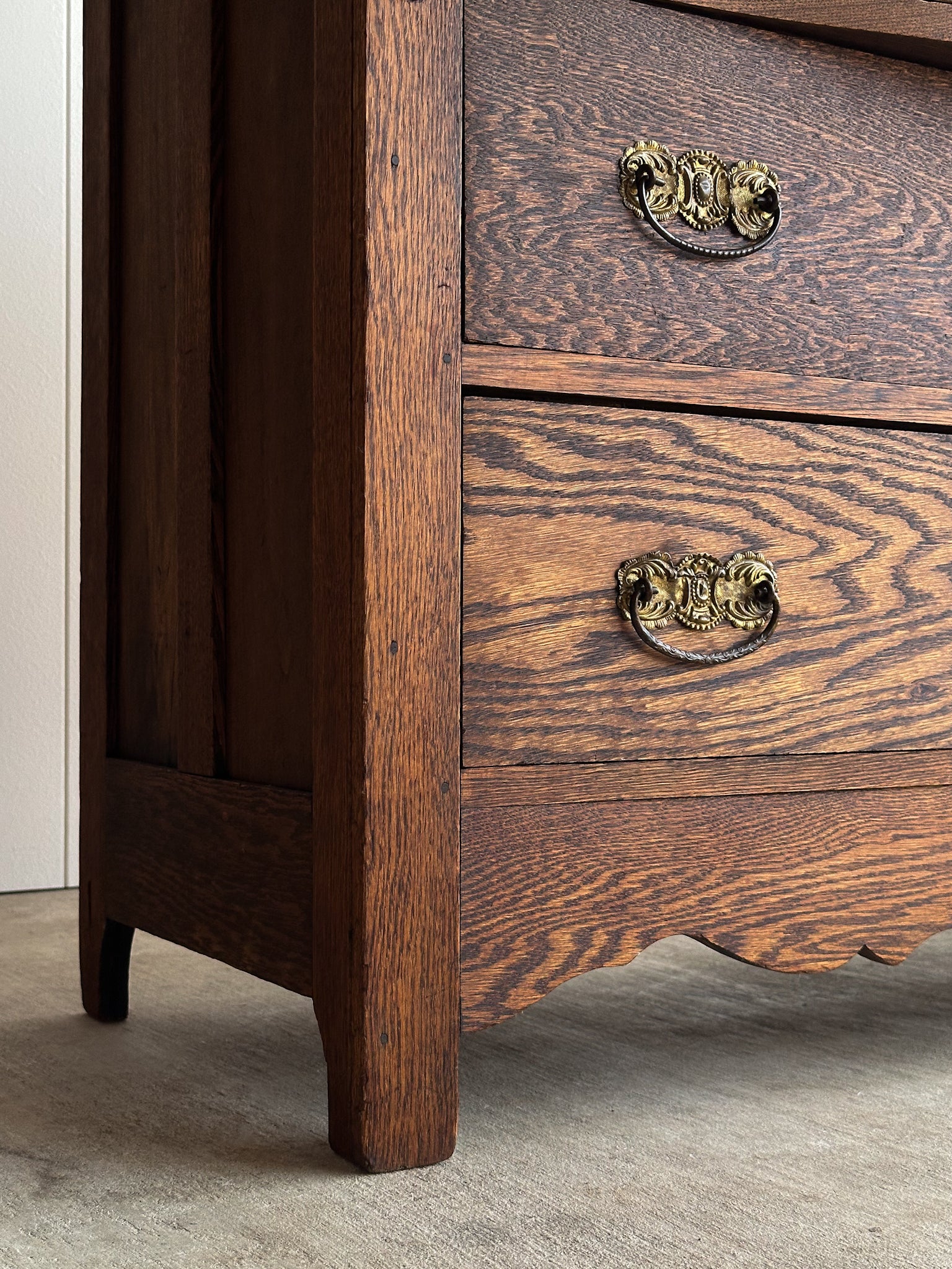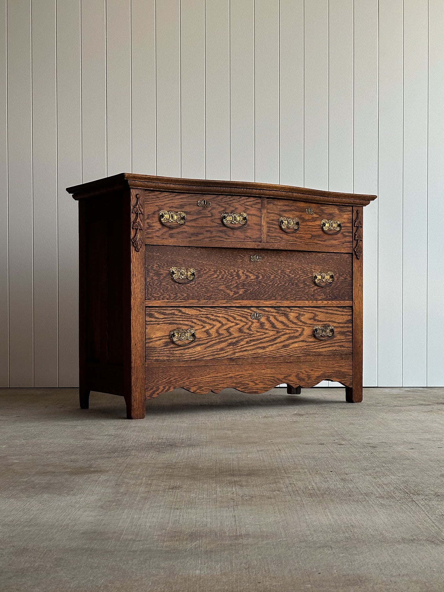 Antique chest of drawers with a softly bowed serpentine front and pronounced cathedral-grain oak. Two-over-two drawer configuration with original brass bail hardware and carved drop detailing at the stiles. Scalloped apron. Light antique patina. C. 1890–1910.