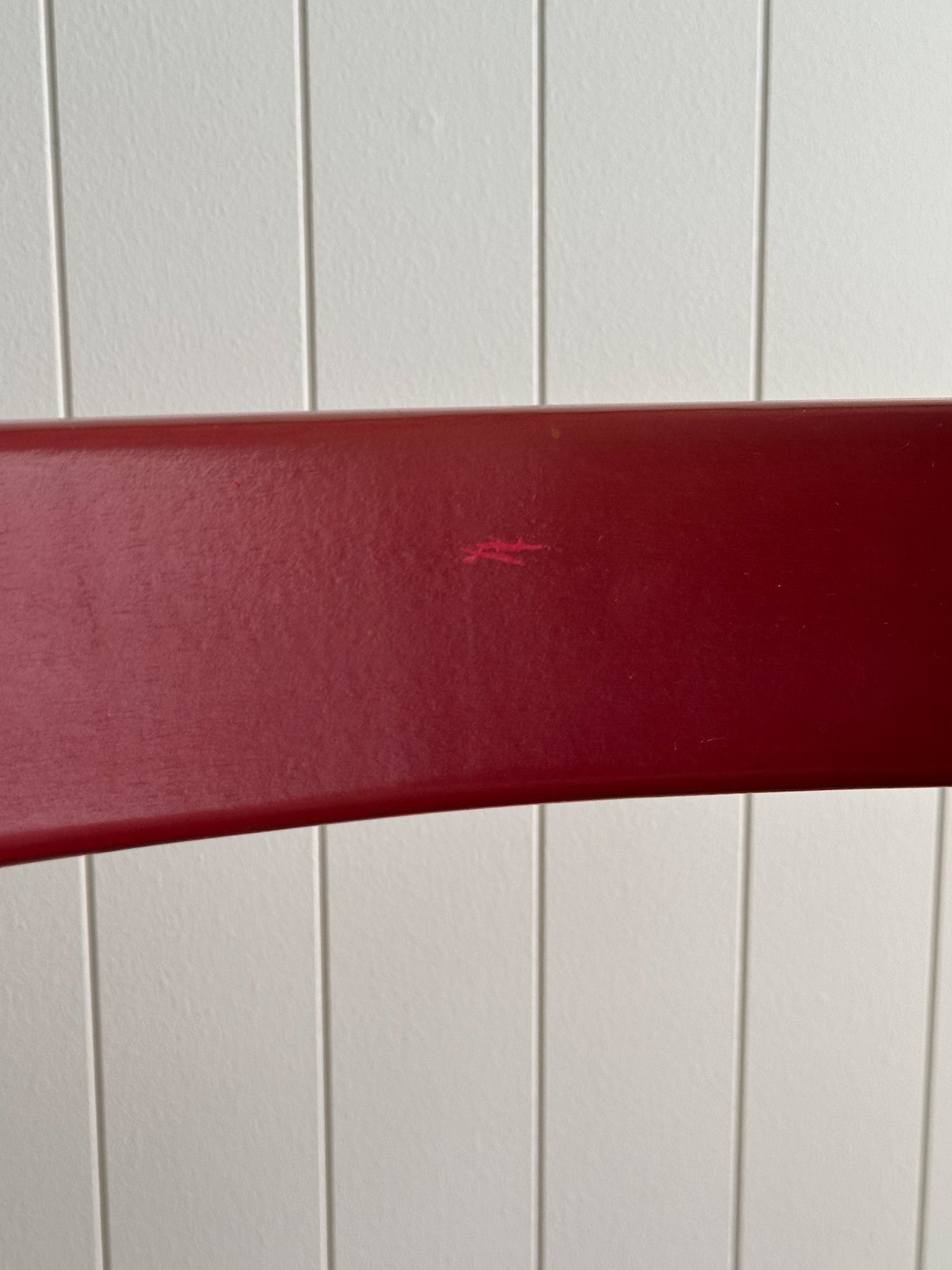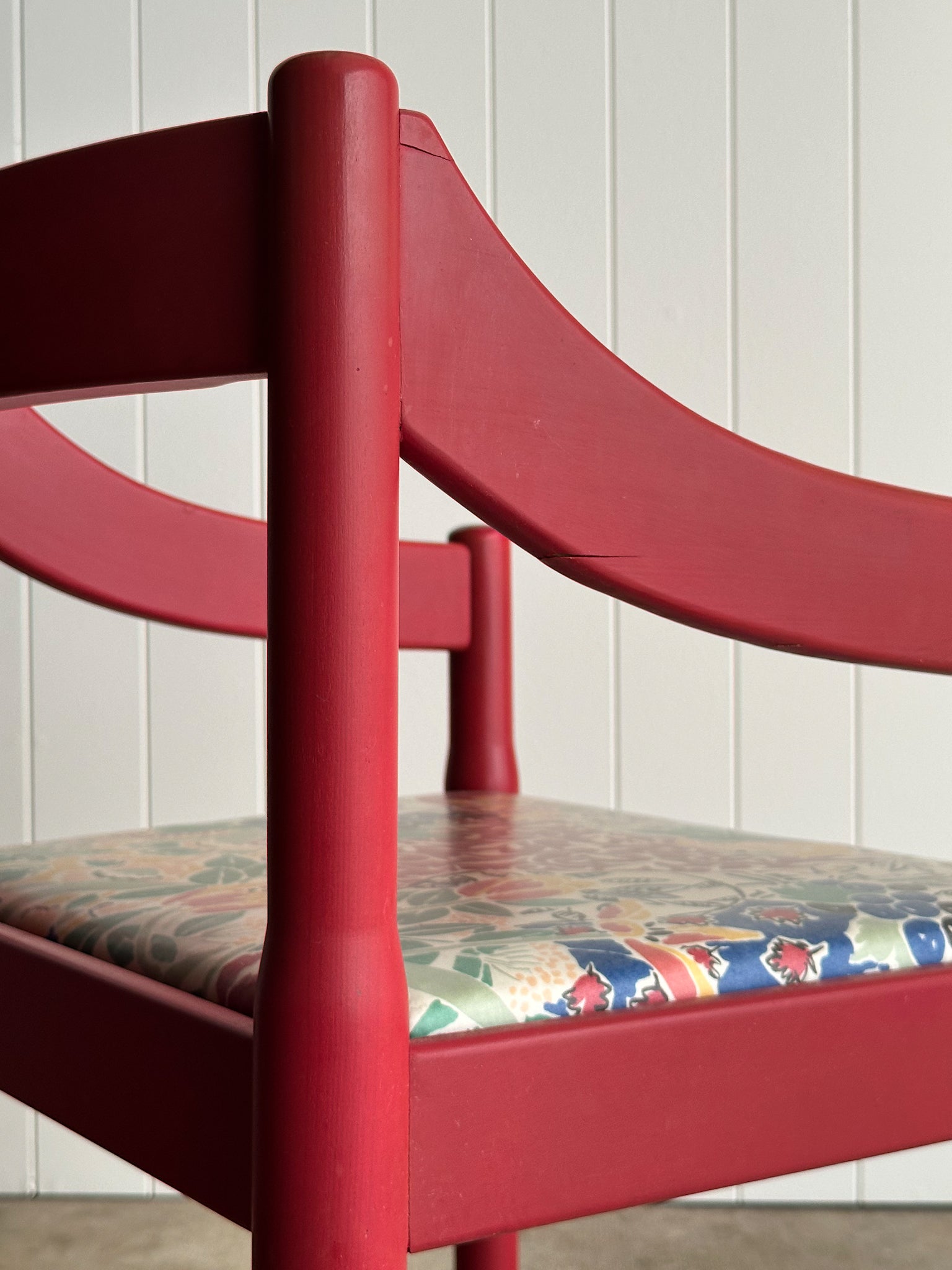 Set of six vintage sculptural dining chairs in a red lacquered finish, with rounded cylindrical legs, softly curved arms, and a restrained open back. Visible vintage wear to the lacquer and wood, with light marks and color variation throughout.