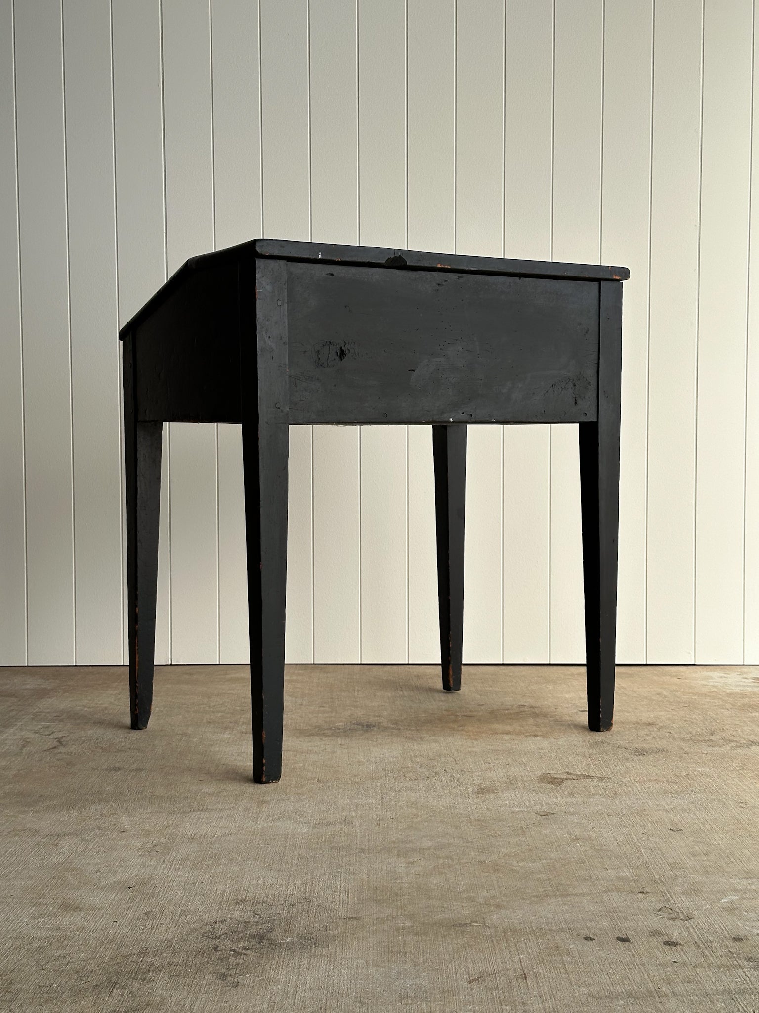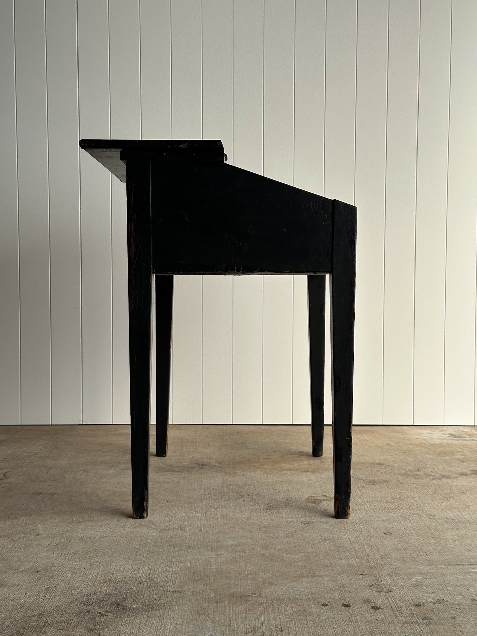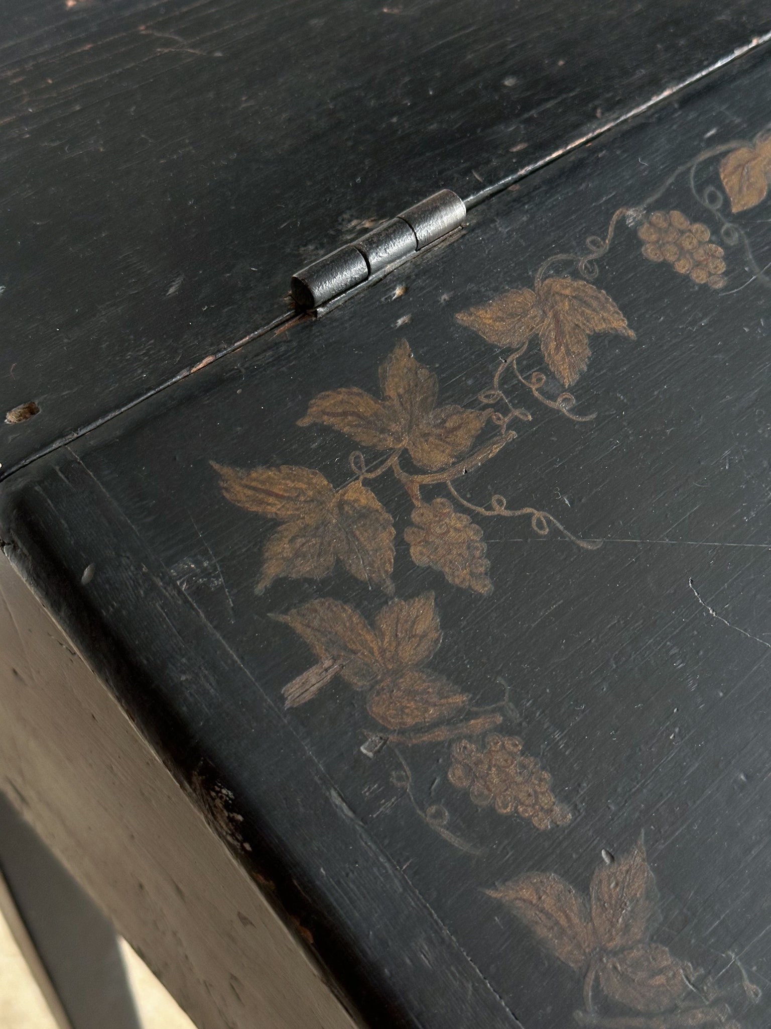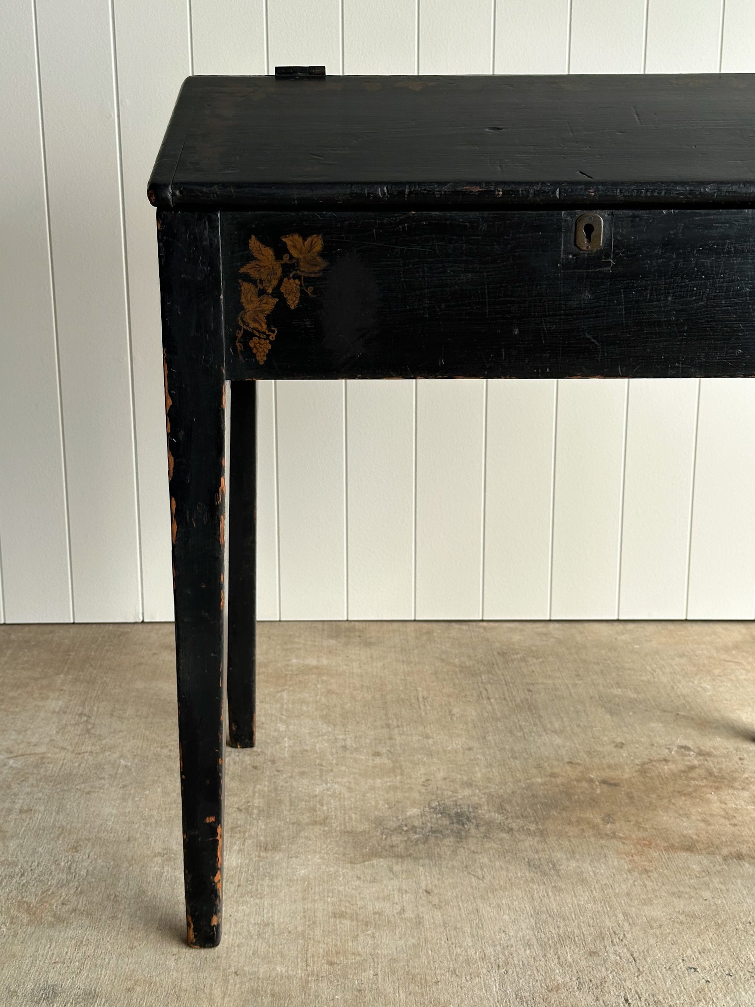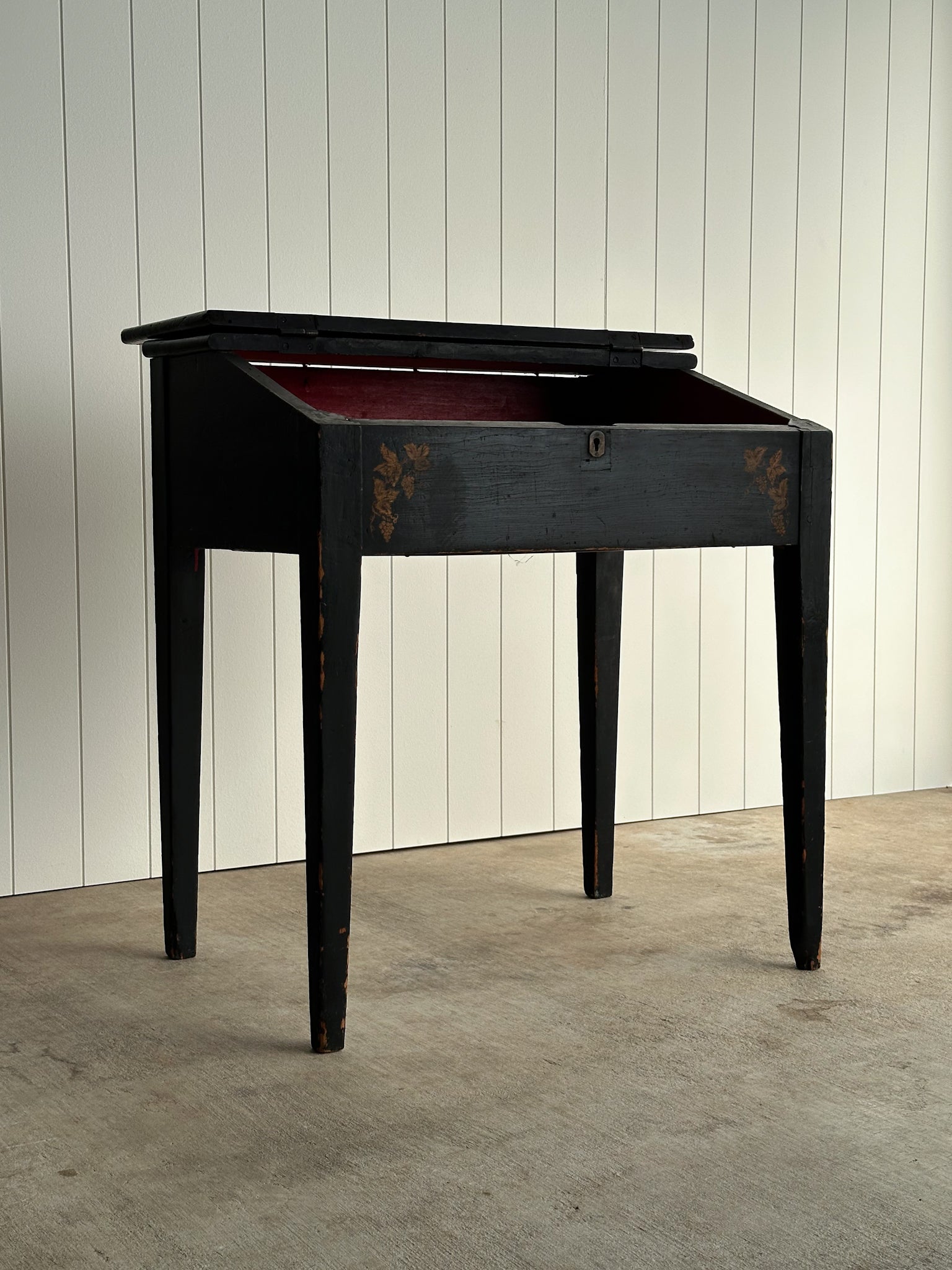Antique slant-front writing desk in original black paint with hand-painted vine and grape motif. Hinged lid opens to a red-painted interior with single shelf, a traditional choice used to warm and reflect low light. Original keyhole present. Surface patina throughout, with visible writing indentations and edge rub-through revealing the wood beneath. C. 1820–1840s.