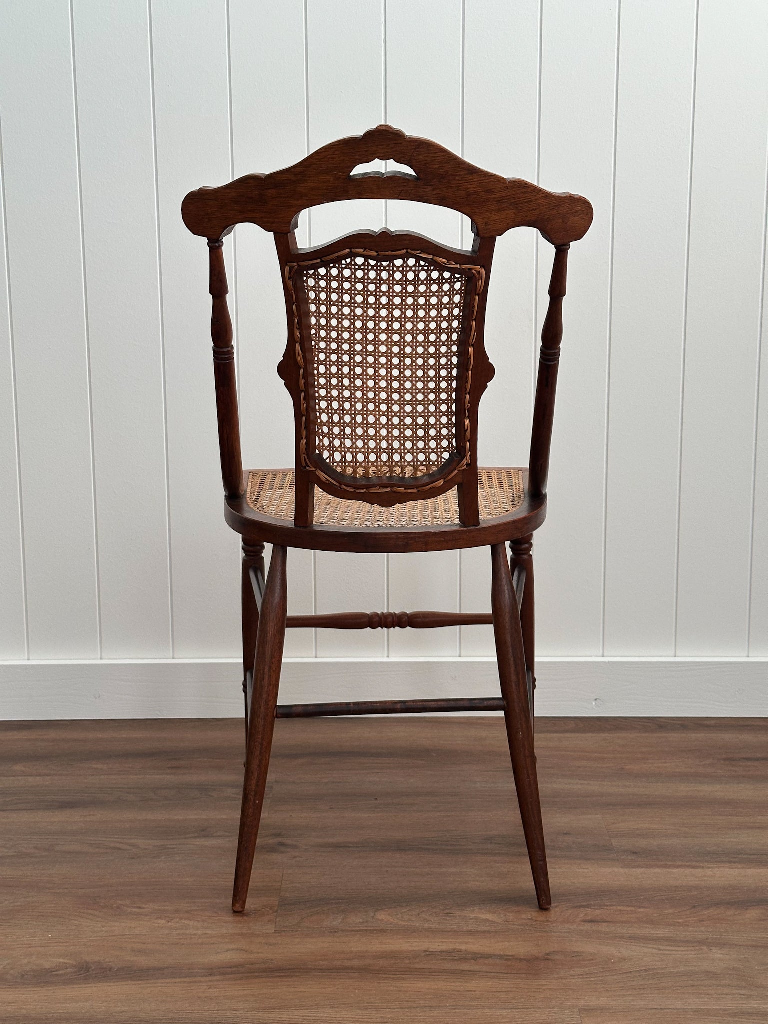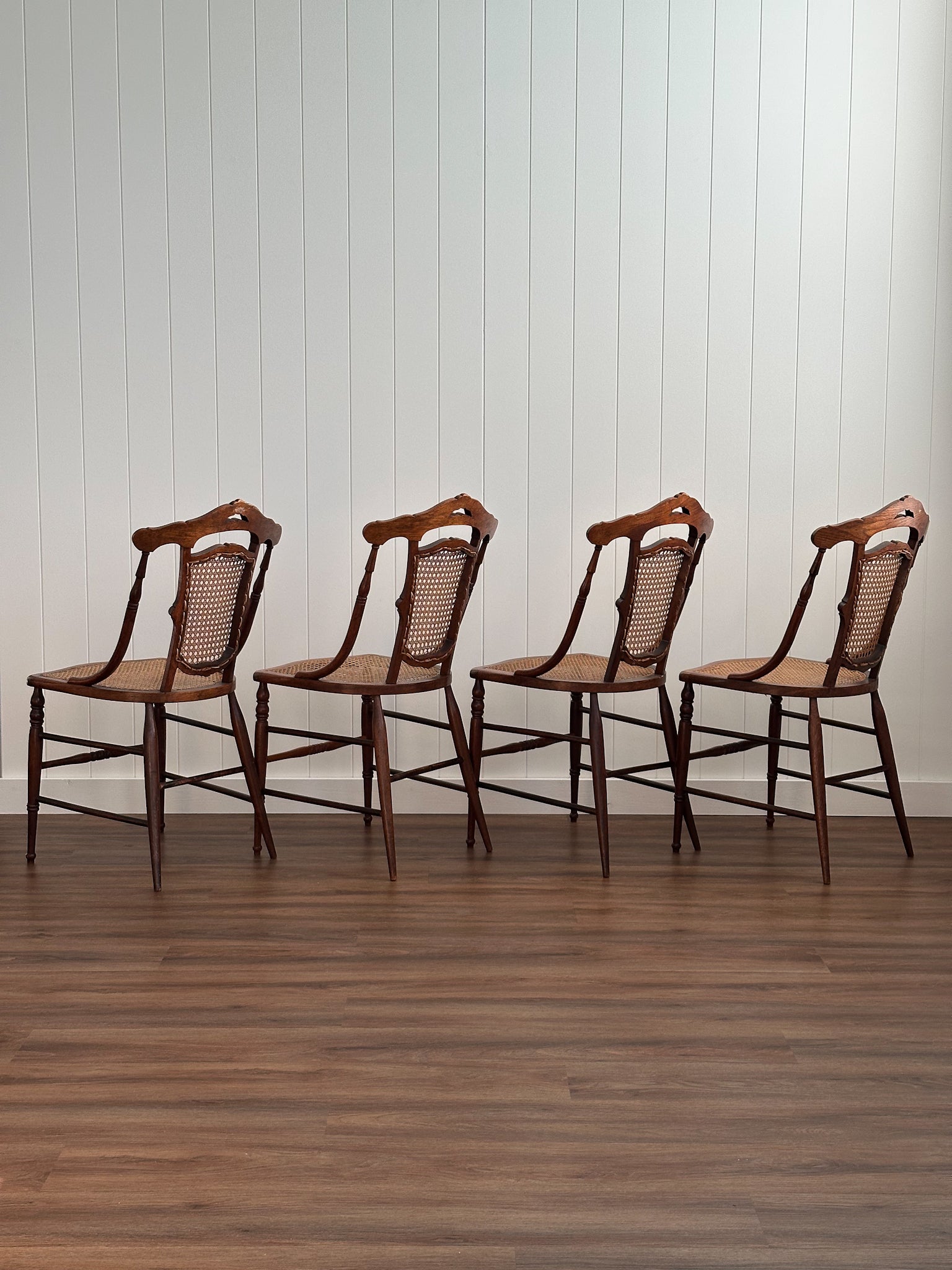 This set of four antique dining chairs dates to the late Victorian period and reflects a European-influenced approach to everyday seating—functional, well-made, and perfectly decorative. Crafted from warm-toned wood and detailed with finely preserved cane, the chairs carry a sense of age and continuity without feeling too formal.