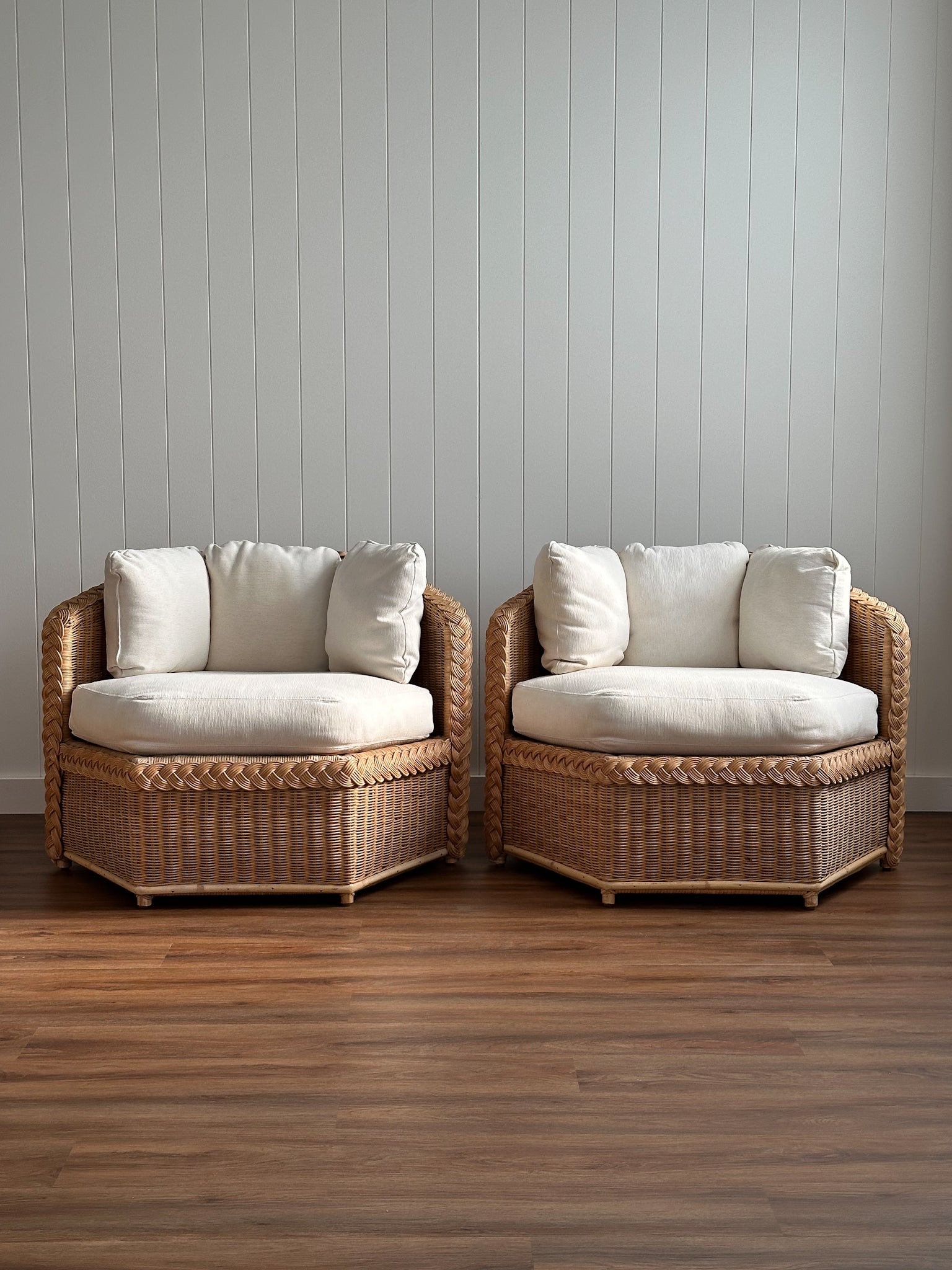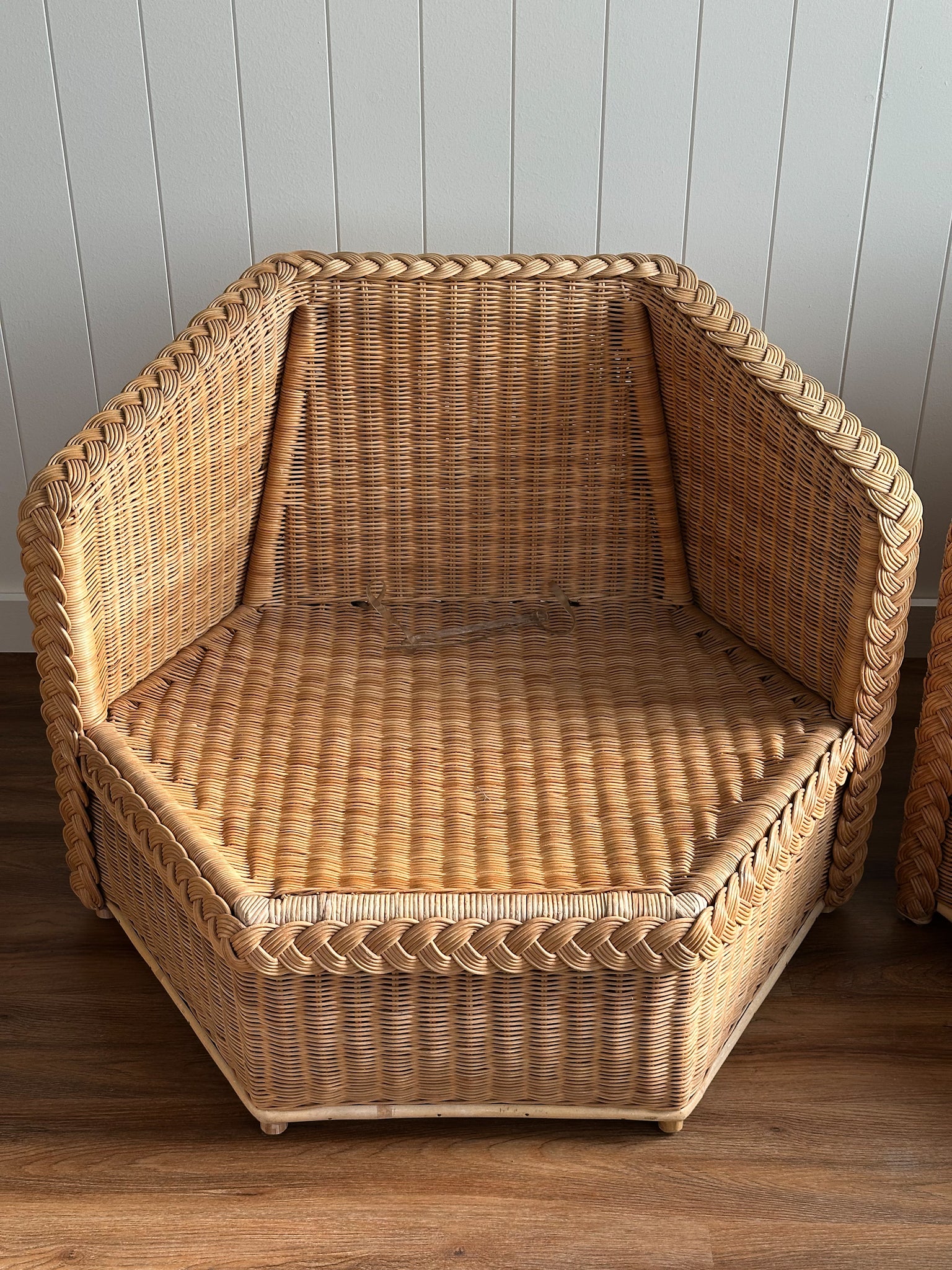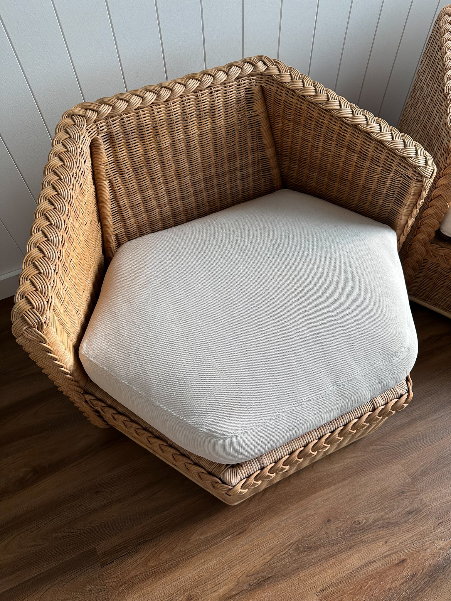 This vintage pair of lounge chairs is handwoven from braided rattan, with low, architectural profiles and a warm honey tone that catches natural light. The hexagonal frames give the chairs structure and presence, while the open weave keeps them easy and lived-in. Soft neutral cushions rest within each frame, adding comfort while allowing the braided rattan and form to remain the focus.