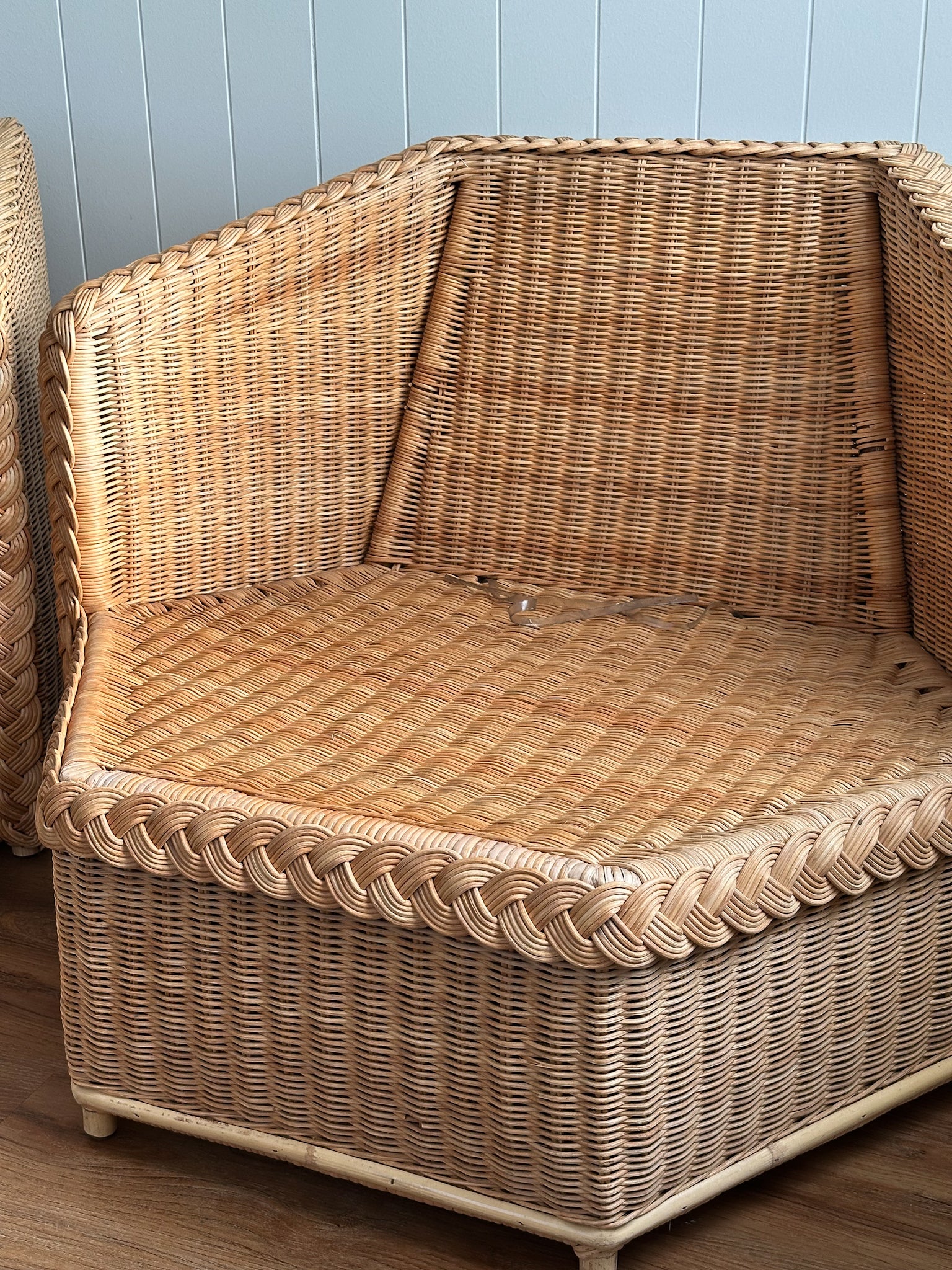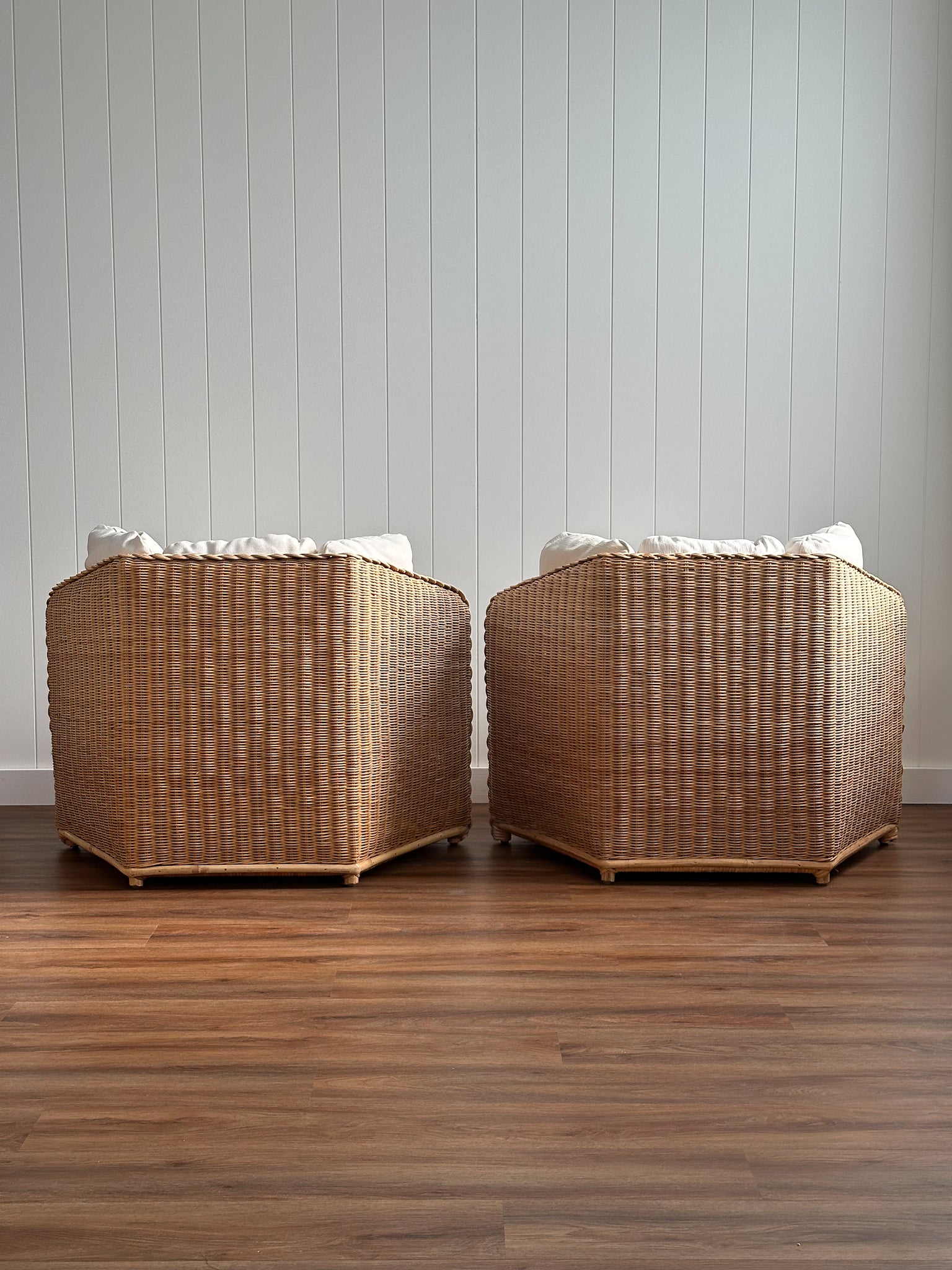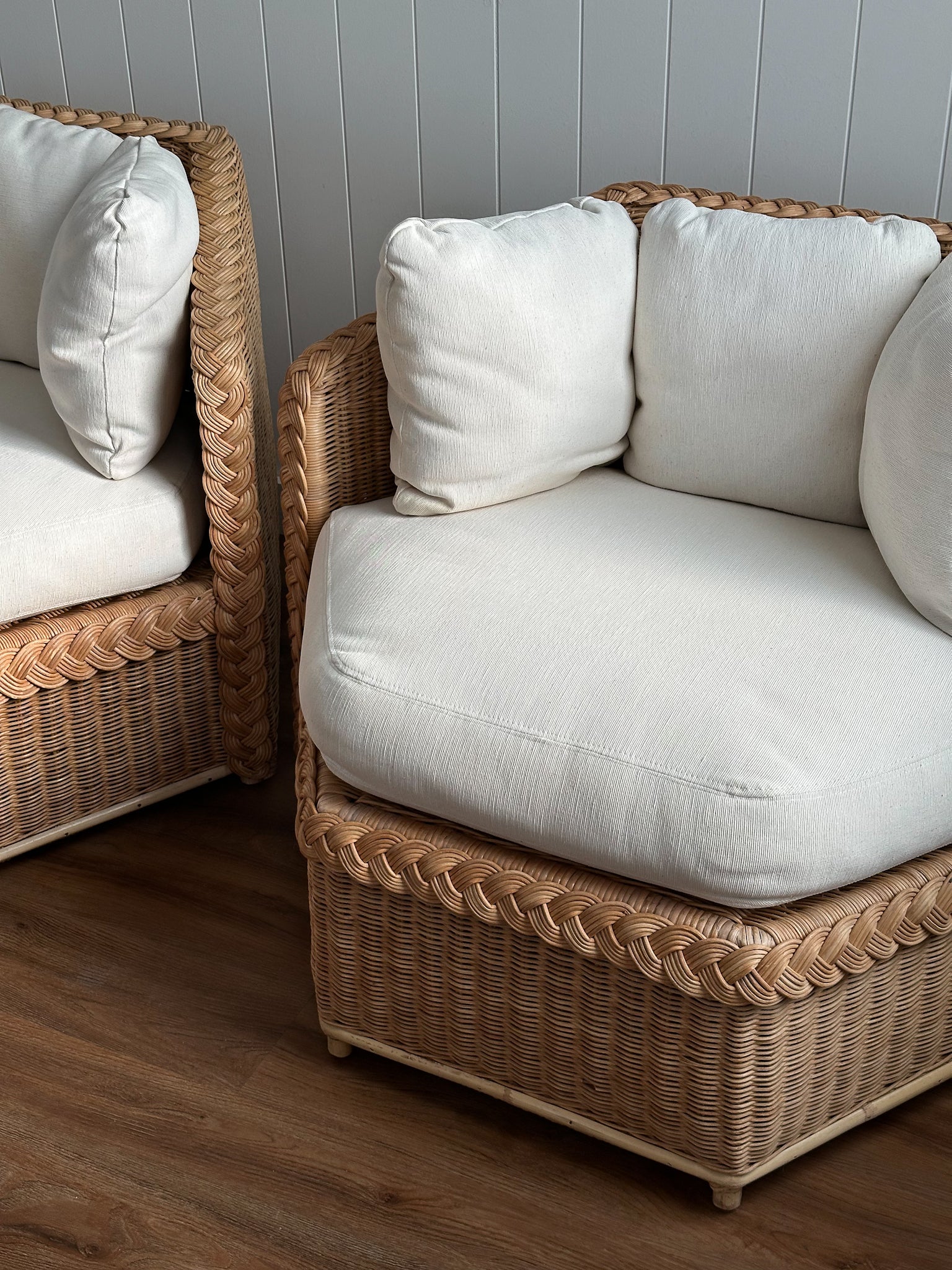 This vintage pair of lounge chairs is handwoven from braided rattan, with low, architectural profiles and a warm honey tone that catches natural light. The hexagonal frames give the chairs structure and presence, while the open weave keeps them easy and lived-in. Soft neutral cushions rest within each frame, adding comfort while allowing the braided rattan and form to remain the focus.