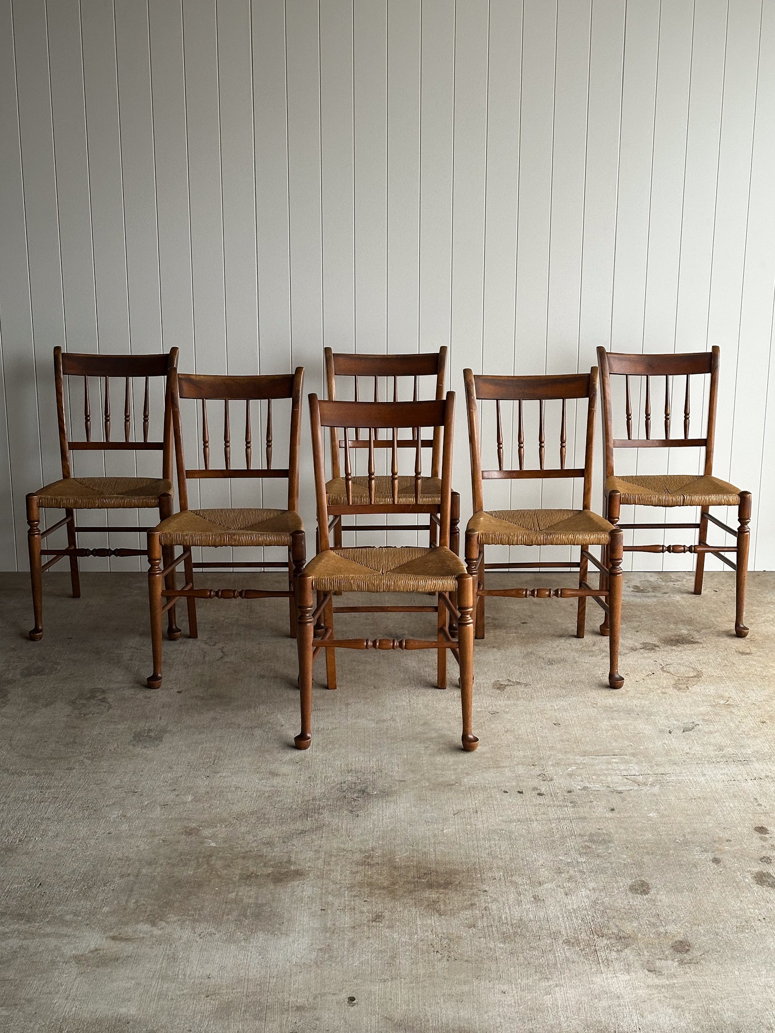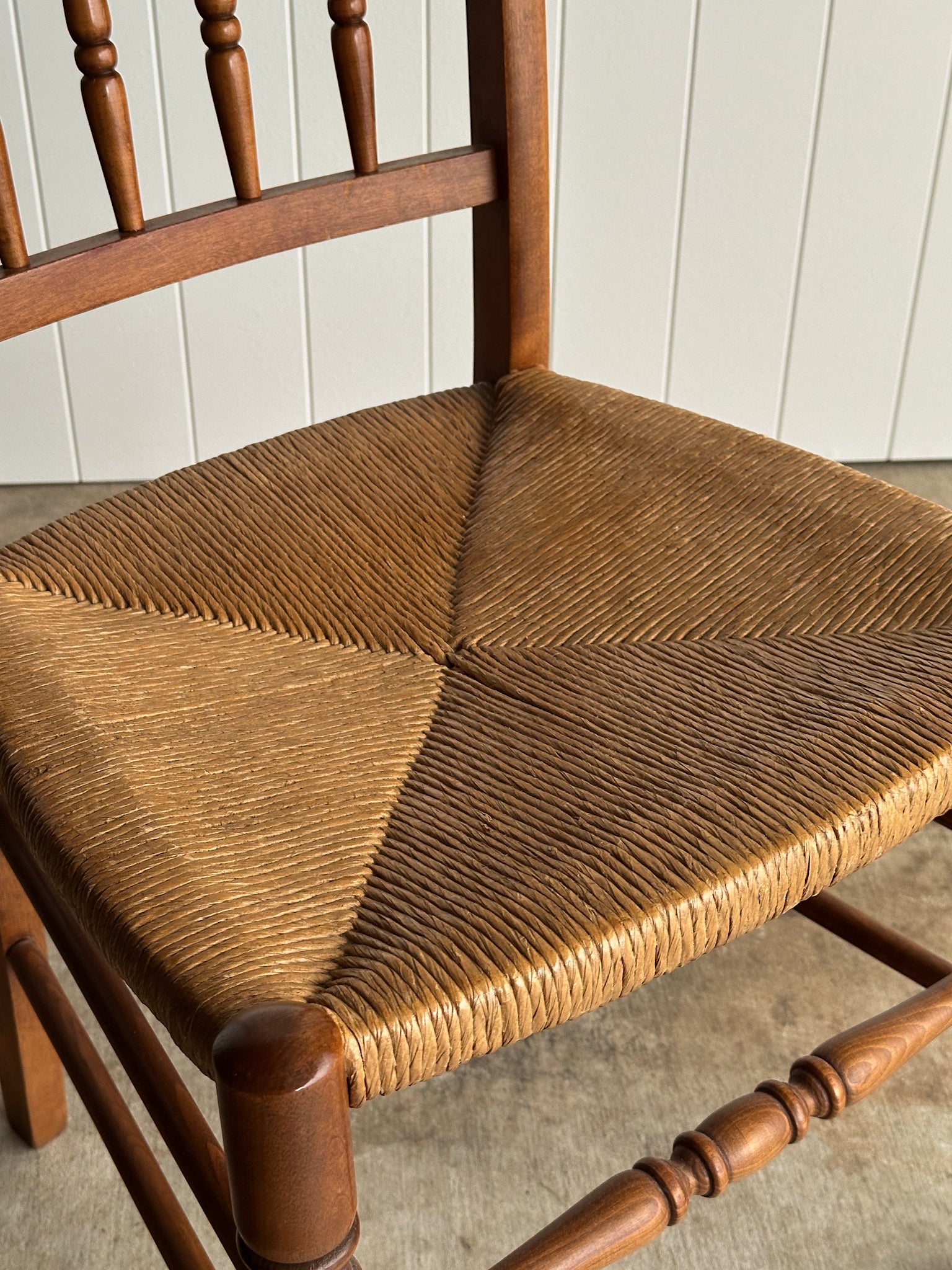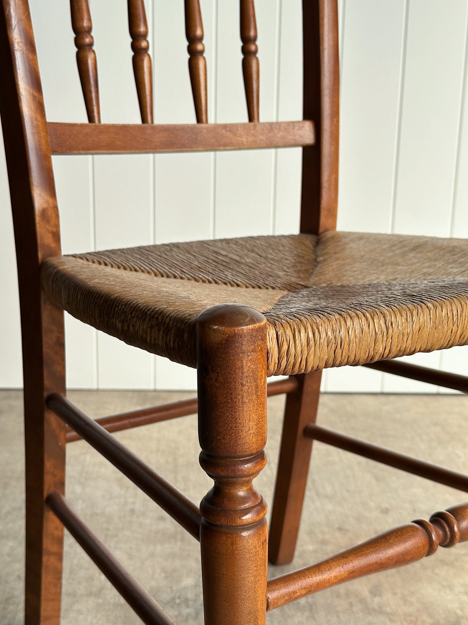 Set of six vintage dining chairs crafted with solid maple frames, spindle backs, and hand-woven rush seats. Warm, time-softened finish and patina throughout, with light vintage wear. C. 1960.